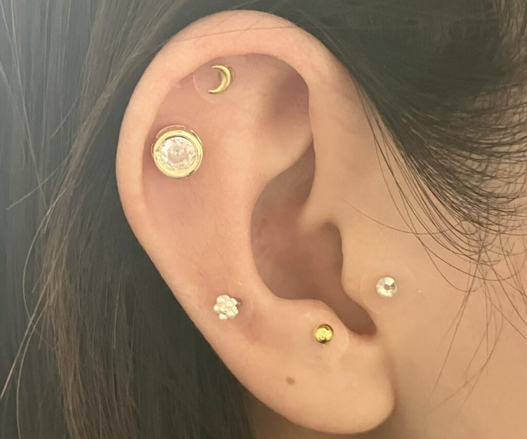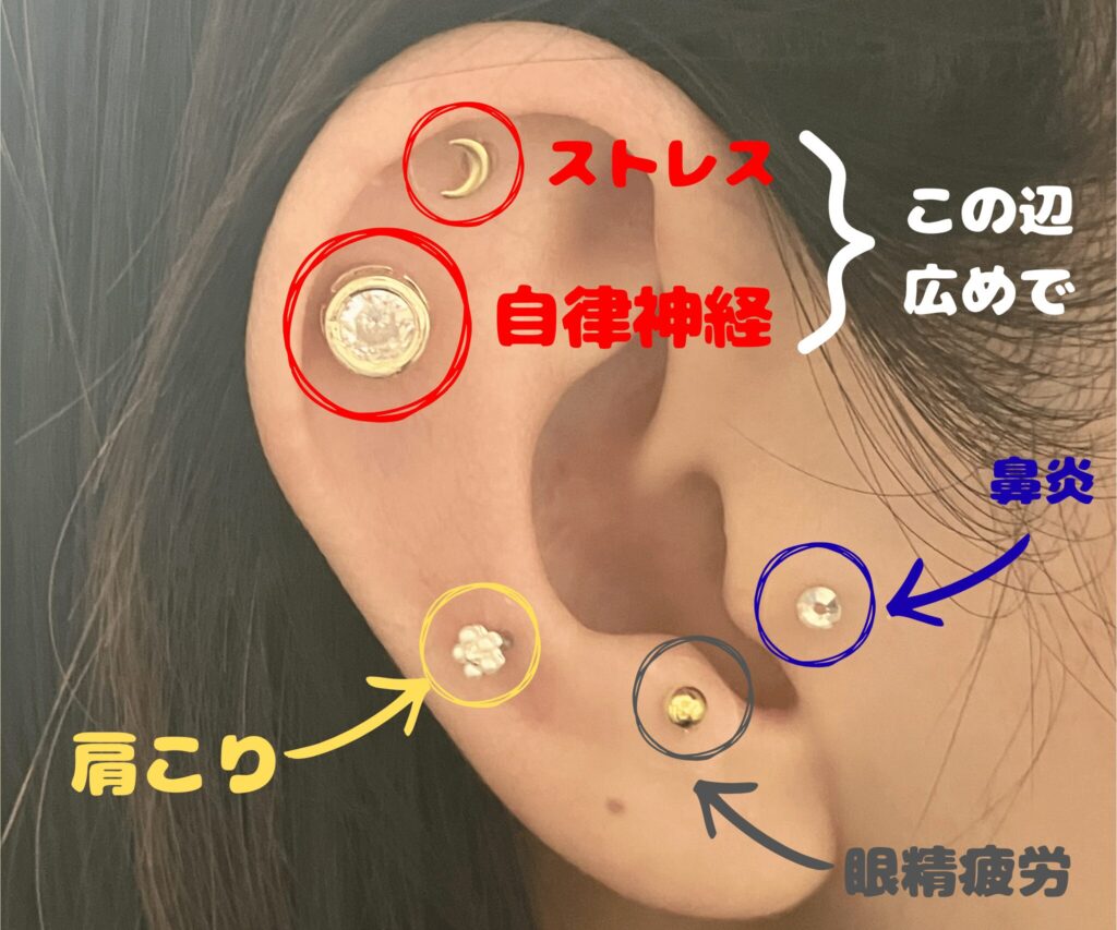 通常は、チタンや金の粒を医療用テープで止めてツボを刺激するのですが、近年は装飾をほどこし、ピアスのようにおしゃれとしても楽しまれています♡